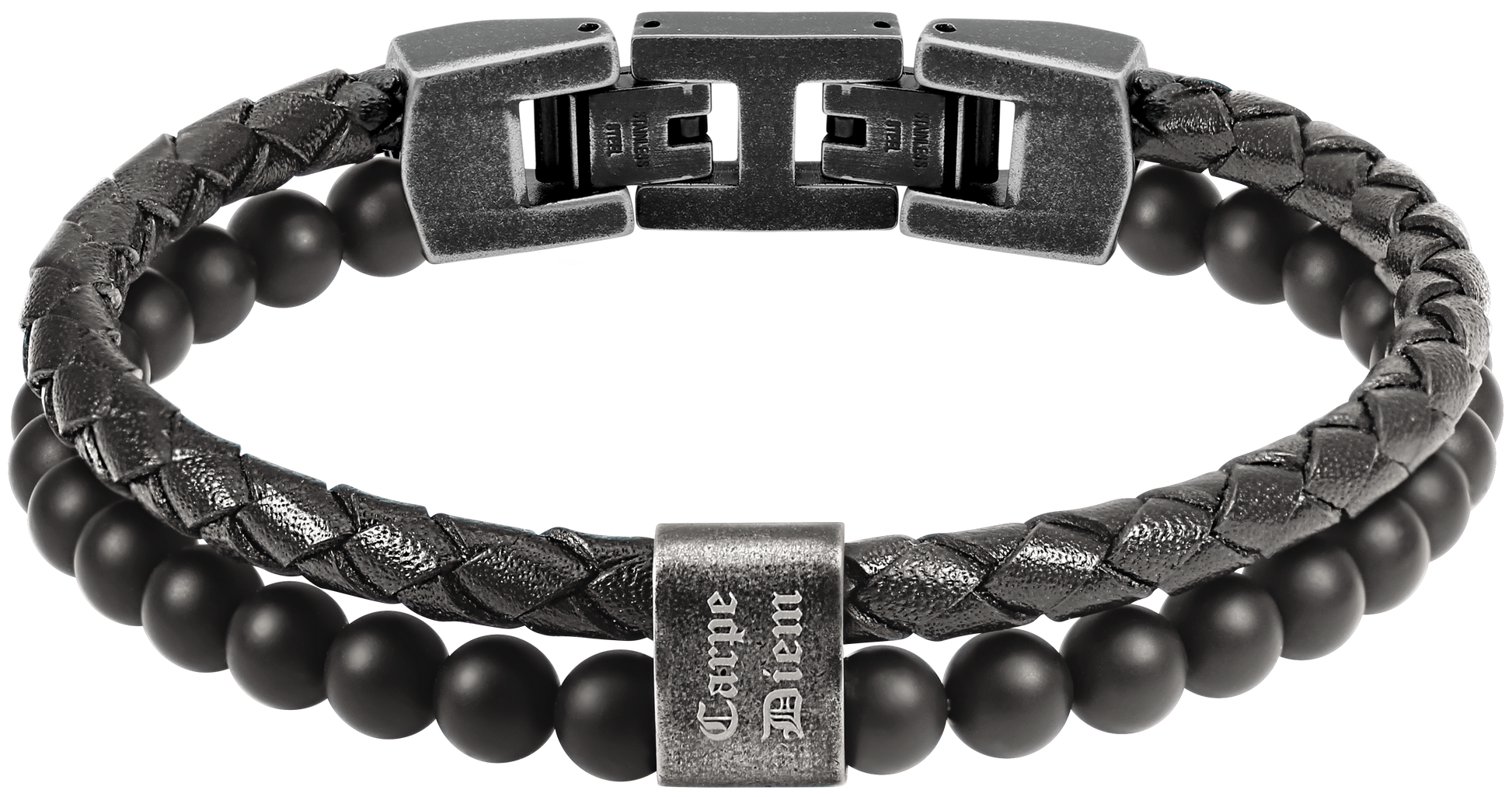 KARMA: BRACELET 13MM, BLACK BRAIDED LEATHER STRAP BLACK AGATES. 21.5CM, ADJUSTABLE. "CARPE DIEM" ENGRAVING.