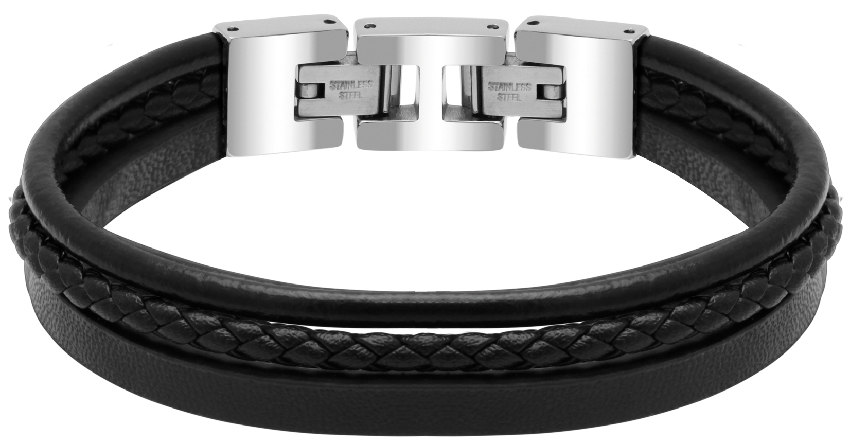 STANFORD: POLISHED STEEL BRACELET, BLACK FLAT, ROUND, AND BRAIDED LEATHER STRAPS. 21CM ADJUSTABLE.